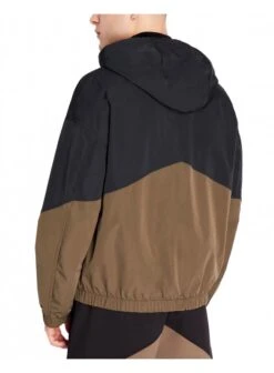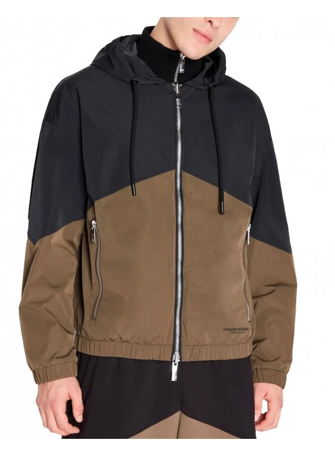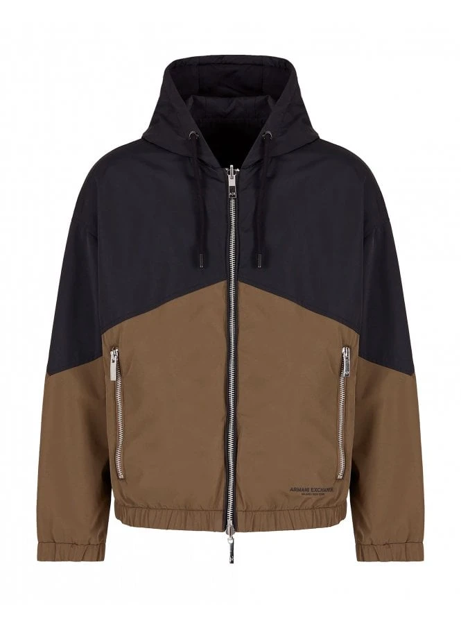 Armani Exchange hooded blouson jacket made from a techno fabric featuring a two contrasting panel and branding close to the hem.