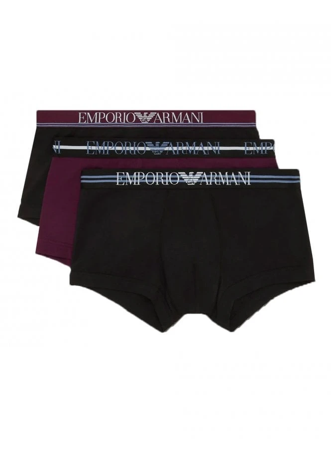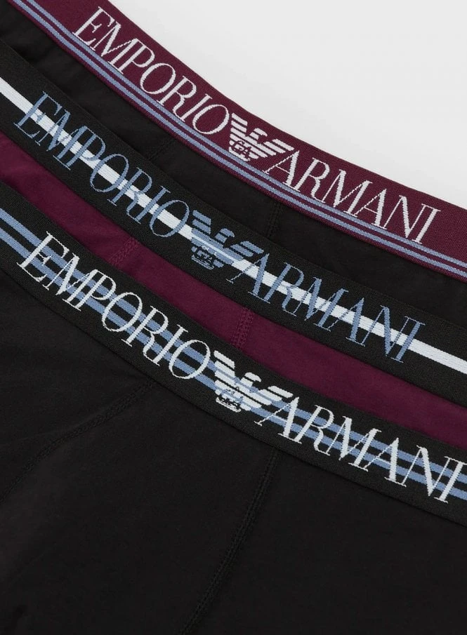 The Emporio Armani 3 Pack trunks underwear in Nero/prugna/nero are a pack of 3 boxer shorts with an elasticated logo waistband.