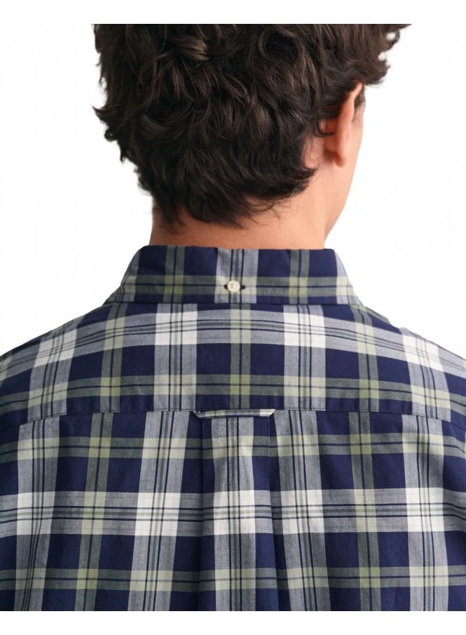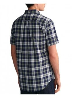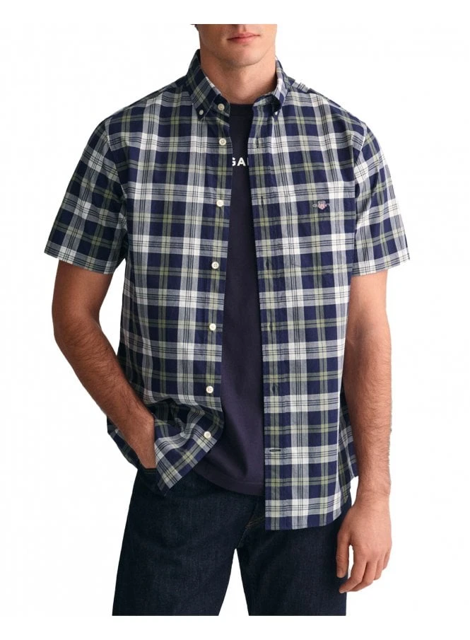 Made with a premium poplin fabrication, this short-sleeved shirt is cut for a regular fit and features a classic value-down collar. Adorned with an all-over yarn-dyed checked pattern, the shirt is also detailed with a curved hem, recycled polyester values, a GANT shield graphic embroidered at the chest pocket and a box pleat with our signature locker loop at the back.