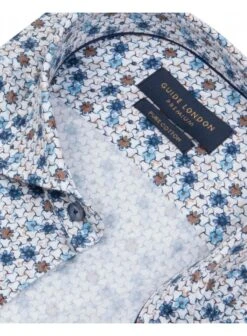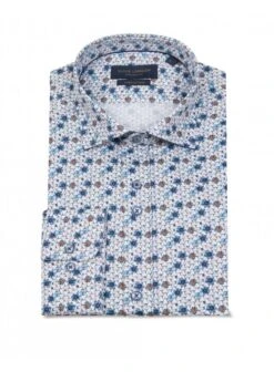 Elevate your style with our Men’s Geometric Print Shirt. Blues and tans on a white base, crafted from premium pure cotton with a sateen finish. Perfect for any occasion, stand out in comfort and sophistication.