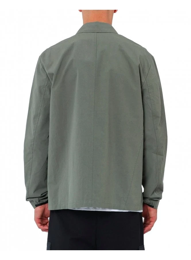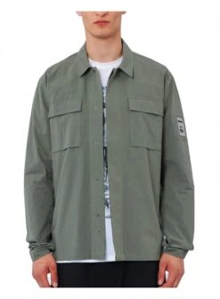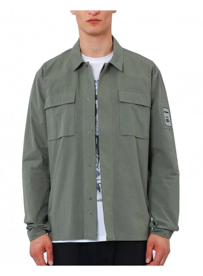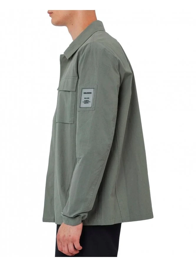 The Terrace Overshirt. Made in cotton. Shaped to a regular fit in olive green. With utility-inspired flap chest pockets, shirt collar and hidden snap fastenings. Finished with our signature clear RELIGION rubber badge on the sleeve.