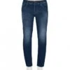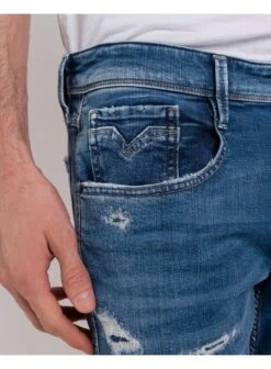Slim fit jeans with regular waist and tapered leg for a comfort fit. With an authentic look, the garment is made of 10,5 oz dark indigo super stretch cotton denim with a stonewashed light wash tone. The five pocket item is characterized by the bleach treatment which creates contrasting colours on used areas and breakages with patches and mends on the legs. Zip and value fly