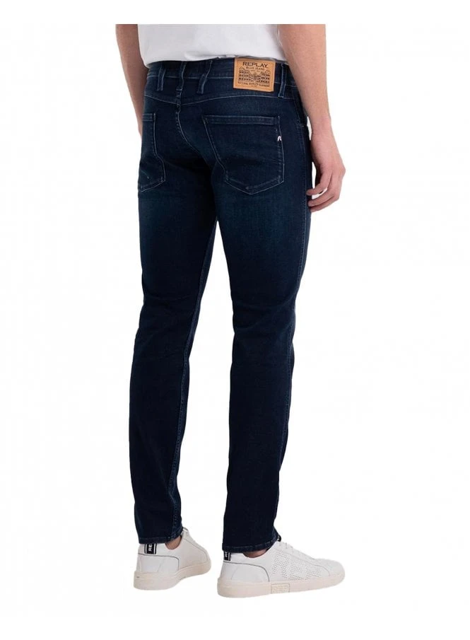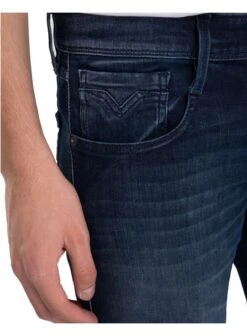 Slim fit Anbass jeans with regular fit and tapered leg for a comfort fit. With an authentic look, the garment is made of 10 oz dark indigo power stretch cotton denim with a dark wash tone. The five pocket item is characterized by the handmade scraping treatment which creates contrasting colours on used areas. Zip and value fly.