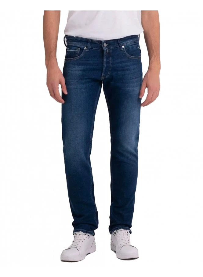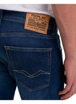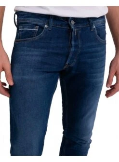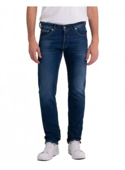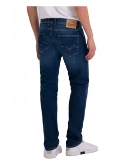 Straight fit jeans with regular waist and straight leg for a comfort fit. The garment is made of 11 oz indigo stretch cotton denim with a dark wash tone. The five pocket item is characterized by the enzyme treatment which creates contrasting colours on used areas. Button fastening.