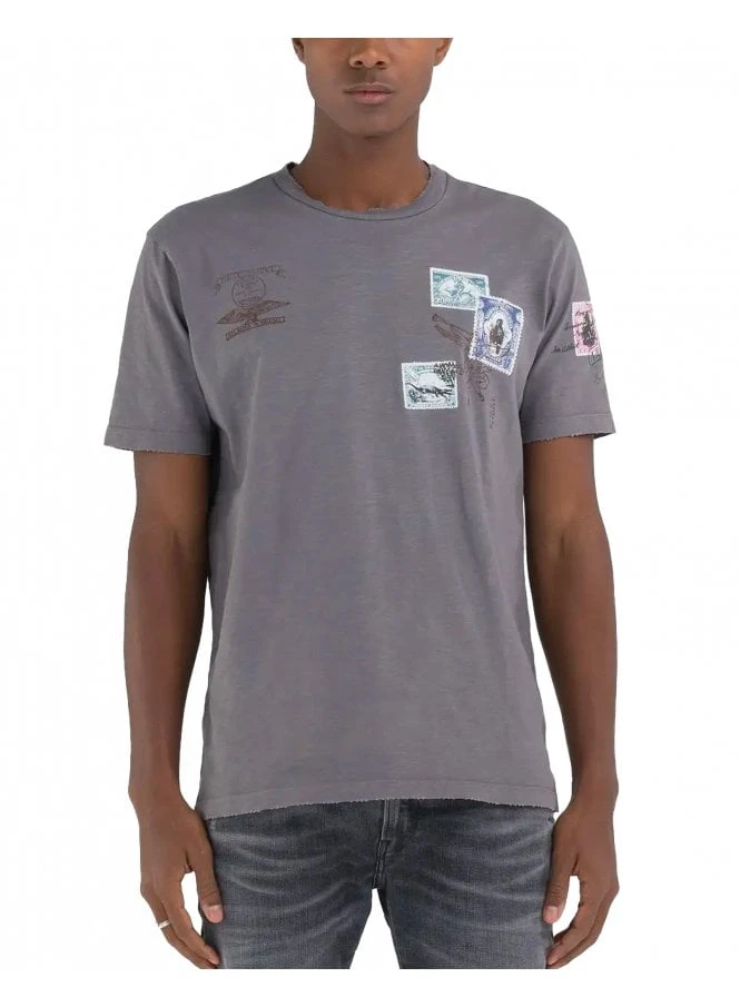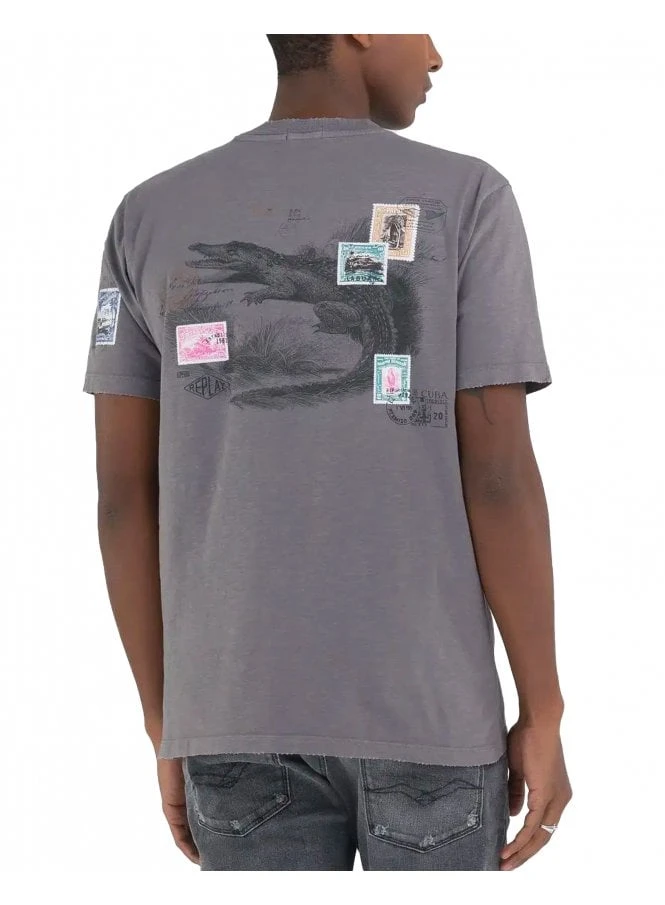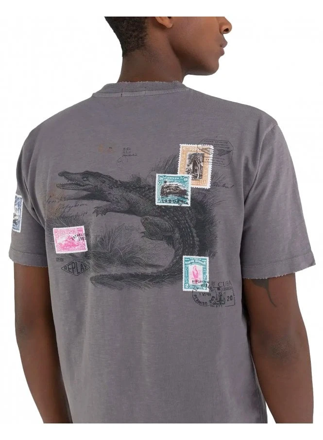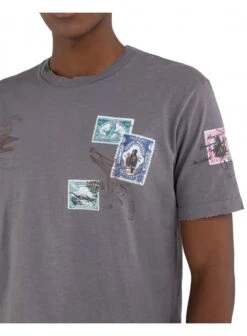 Crewneck t-shirt made of garment-dyed slub cotton jersey. The short-sleeved garment is characterized by the customized vintage print with stamps on the chest and with by the Cuba motif with crocodile at the back.